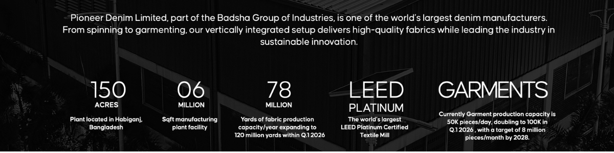 Pioneer Denim – Redefining the Future of Vertical Integration Pioneer Denim is a global leader in the denim industry, operating as a fully vertical, state-of-the-art partner. Located in Habiganj, Bangladesh, our 150-acre facility is a benchmark for the future of textile manufacturing, proudly holding the LEED Platinum Certification—the highest international standard for green building and sustainable operations. The Power of Vertical Integration Our unique competitive advantage lies in being vertically integrated with the group’s largest spinning units. This allows us to maintain 360-degree quality control: from the selection of the raw fiber to the final stitch of a finished garment. We don’t just manufacture; we engineer denim. By utilizing high-tech machinery from Italy, Germany, the USA, Switzerland, and Belgium, we ensure precision, consistency, and superior hand-feel in every yard. Innovation & Sustainability At Pioneer Denim, sustainability is not a buzzword—it is our operating system. Our "Eco-Intelligence" approach includes: Advanced Water Management: Massive reduction in water consumption through high-tech filtration and recycling systems. Energy Efficiency: Utilizing renewable energy sources and heat recovery technology to minimize our carbon footprint. Zero-Waste Ambition: Continuous research into recycled fibers (Pre and Post-consumer) and biodegradable finishes. Key Figures & Capabilities: Massive Capacity: Currently producing 60 million yards annually, with a strategic expansion to 100 million yards by 2026. Full Package Solutions: A garment division capable of delivering 50,000 high-quality pieces per day. Fabric Diversity: From 4oz lightweight shirting to 20oz heavy-duty denim. Our portfolio includes Selvedge, Super Stretch, Knit Denim, Coated, and Printed finishes, tailored to the specific needs of global fashion brands. Your Strategic Partner We combine the agility of a design-driven studio with the muscle of a global industrial giant. Whether you are looking for heritage-inspired fabrics or the next generation of performance denim, Pioneer Denim provides the transparency, scalability, and innovation required to lead the market.